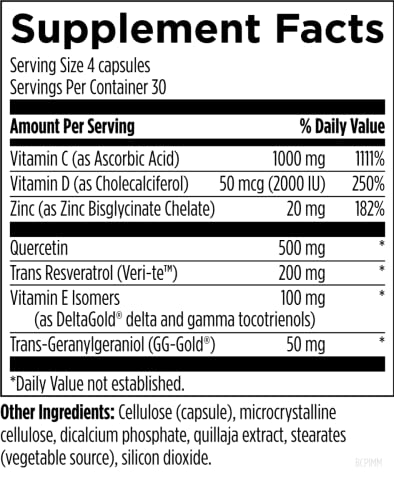 BioCap Immune is uniquely formulated to Reinforce antioxidative status and immune health.* Each and every 4-capsule serving provides 1,000 mg of vitamin C immune Reinforce, along side clinically relevant amounts of the bioflavonoids quercetin and resveratrol (as Veri-Te™), 50 mcg (2,000 IU) of vitamin D, 100 mg of vitamin E isomers (as delta- and gamma-tocotrienols), 50 mg of geranylgeraniol (as GG-Gold®), and 20 mg of zinc. Vitamin C supplement with quercetin zinc.