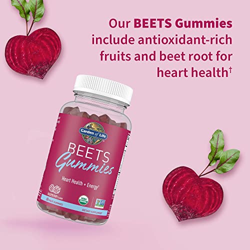 Consuming foods rich in nitrates such as beets, assists the body’s production of nitric oxide. Support your body’s production of nitric oxide (NO)† with Garden of Life BEETS Gummies—a unique blend of concentrated Organic Beets, Tart Cherry and whole food vitamins. Our BEETS Gummy is designed to not only support heart health and build healthy blood cells, but also promote energy production, muscle growth and recovery.† Pre- or post-workout, two gummies deliver a 6.5g polyphenol blend of antioxidant-rich Organic fruits such as Blackcurrant and Tart Cherry for muscle growth and recovery, plus beetroot, 12 mcg of methyl B12 for energy production and 800 IU of vegan vitamin D3 for heart health.† These delicious Raspberry gummies are sweetened using only whole food ingredients such as fruit, beets and the Organic rice meal coating—not cane sugar or glucose syrups. They are proudly Third-Party Certified Non-GMO, NSF Certified Gluten Free, Vegan and Carbonfree.® With BEETS Gummies, get all of the benefits of goodness grown in the earth—without the earthy taste.† †These statements have not been evaluated by the Food and Drug Administration. This product is not intended to diagnose, treat, cure or prevent any disease.