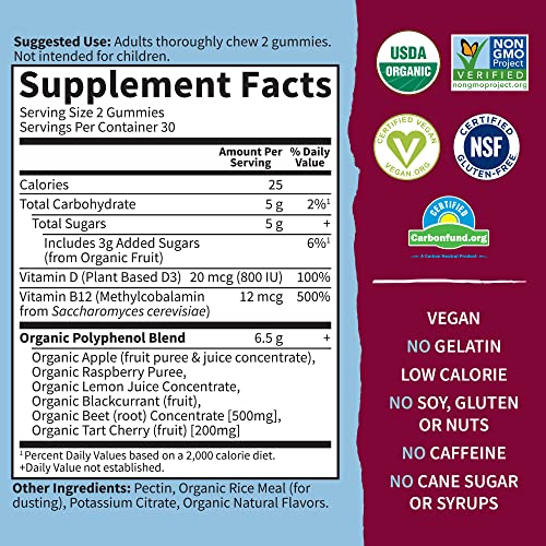FOR A HEALTHY HEART BEET: Beets are rich in nitrates, a compound shown to help improve blood flow; Our Organic Polyphenol Blend has nitrate rich beet concentrate, black currant and tart cherry—plus we’ve added 800 IU of plant based D3 for heart health