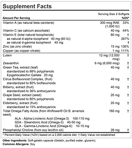SUPERIOR 100% PURE BIO-ACTIVE INGREDIENTS – Provides exceptionally high levels of Lutein and Zeaxanthin along with plant-based Omega-3 fatty acids. Delivers Bilberry and Elderberry, EGCG-rich Green Tea Extract, Citrus Bioflavonoids, OPC-rich (Oligomeric Proanthocyanidins) Grape Seed Extract, along with Phosphatidyl Choline. Contains NO Milk / Dairy-Free, Gluten Free; NO yeast, corn, wheat, sodium, salt, sugar, cholesterol, color, preservative or manufacturing additives.