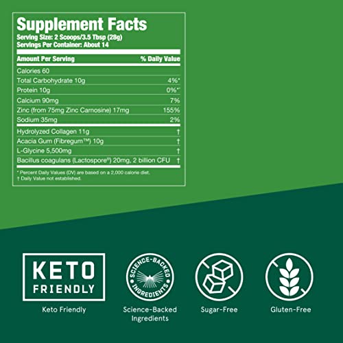Gut Health Collagen Protein contains the right nutrients for healthy digestion, a thriving gut microbiome and a healthy intestinal lining, like probiotics, prebiotics, glycine and zinc carnosine