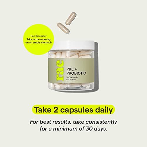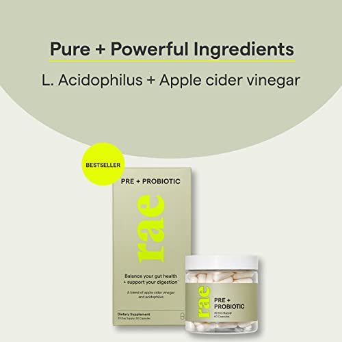 GUT HEALTH + DIGESTION SUPPORT. Rae Pre+Probiotic Capsules are a blend of both probiotics and prebiotics including apple cider vinegar and acidophilus. This nutritional supplement supports a calm gut, aids healthy digestion and promotes elimination.