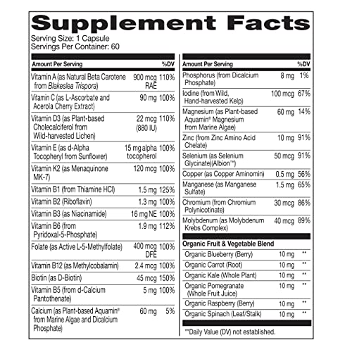 Plant-Based: Featuring premium plant-based vitamins and minerals including as Vitamin D3 from lichen, Vitamin E from sunflower, plant Calcium and Magnesium from marine algae, and Iodine from kelp.