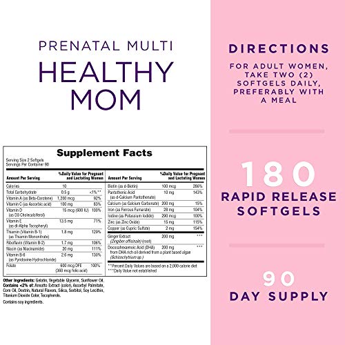 Nature’s Bounty Optimal Solutions Healthy Mom Prenatal Multi is a comprehensive high-potency multivitamin and multi-mineral formula designed to nourish you and your baby. Our formula contains 18 nutrients, including beneficial plant-based DHA, ginger, and 100% daily value of iodine and folic acid per serving. This can help to meet your nutritional needs allowing you to feel healthy on the inside for a beautiful mom glow on the outside.*