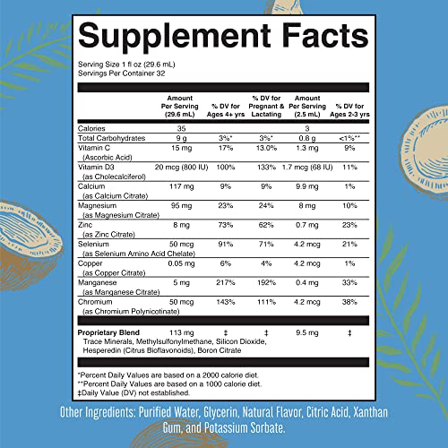 Vegan Formula: Vitamin C, Vitamin D3, Calcium Citrate, Magnesium Citrate, Zinc Citrate, Selenium, Copper, Manganese, Chromium,Trace Minerals, Methylsulfonylmethane (MSM), Silicon, Dioxide, Hesperidin, Boron Citrate. Other Ingredients: Purified Water, Vegetable Glycerin, Natural Coconut Flavor, Xanthan Gum, Potassium Sorbate.