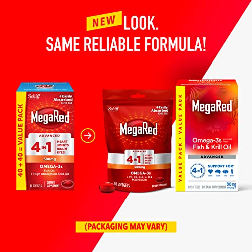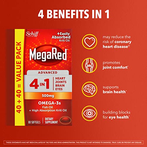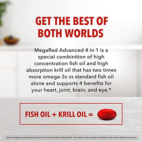 FISH and KRILL OIL, BETTER TOGETHER: MegaRed Advanced 4-in-1 uses a special combination of high concentration fish oil and high absorption krill oil that has 2X more Omega 3s vs standard fish oil alone, and it supports heart, joint, brain, and eye health.